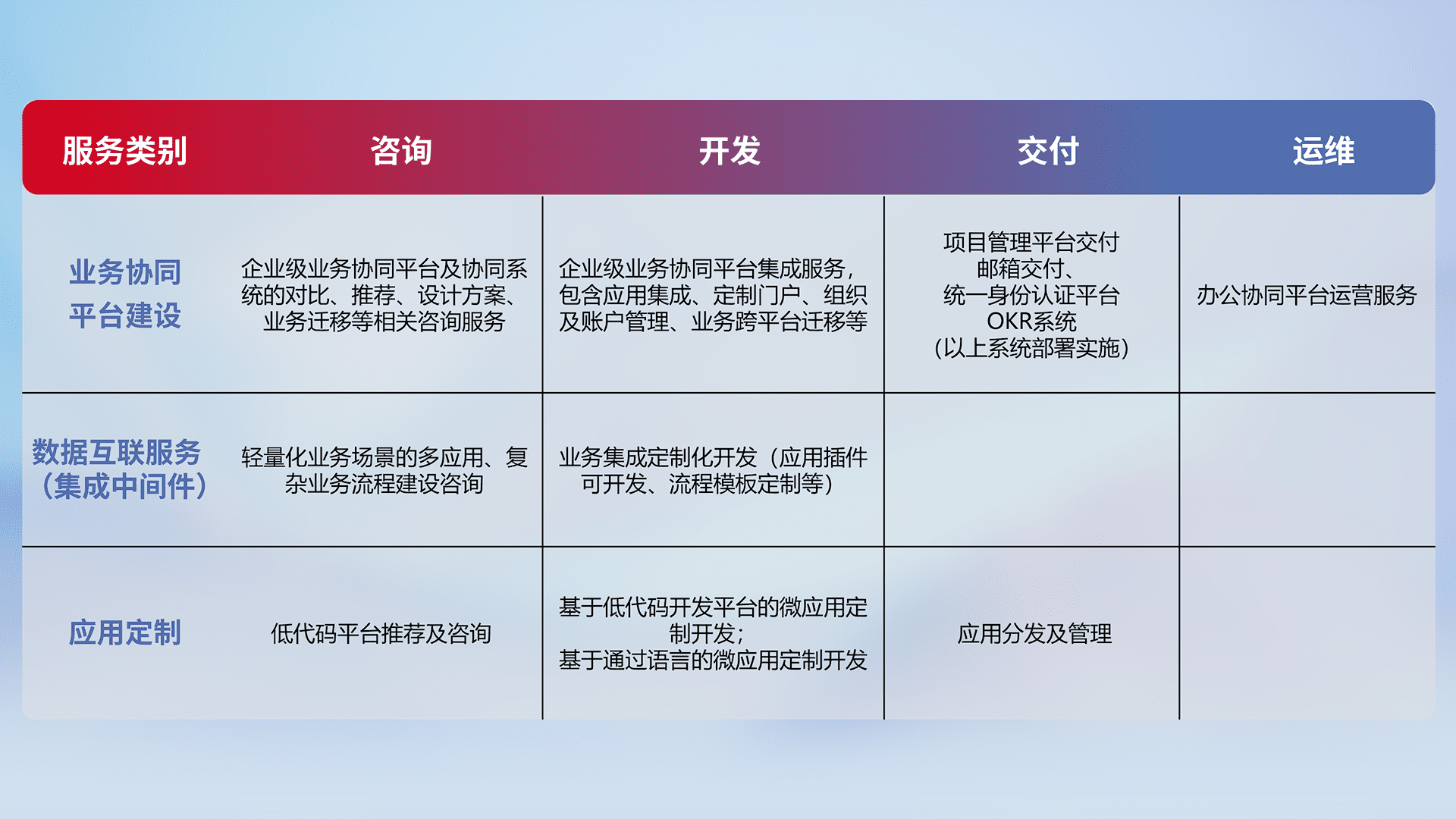 针对钉钉、、、企微、、IDaas等平台级产品提供产品的规划、、、方案、、、、交付、、、定制化开发等服务,,实现如统一协同办公、、、、智能客户服务、、混合会议管理、、、智能数据查询、、、等业务场景,,,,实现数字化转型。。。。